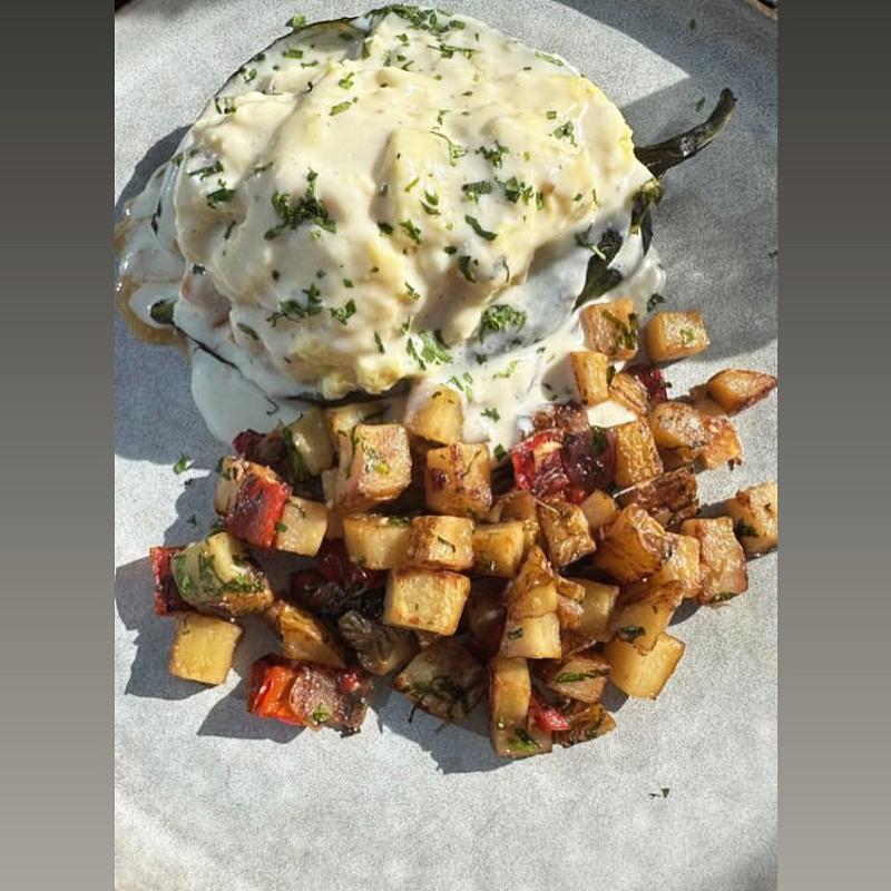 Stuffed with refried black beans, topped with cochinita pibil, tomato, red onions, avocado, two eggs, and hashbrowns.