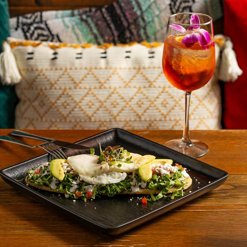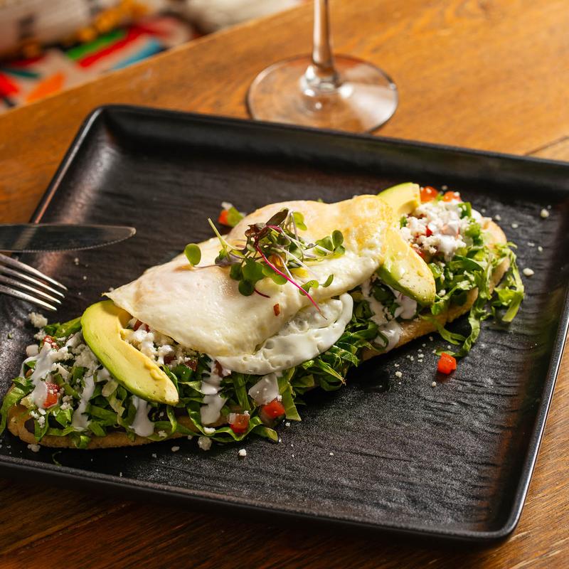 Choice of meat with refried black beans, romaine lettuce, queso fresco, sour cream, avocado, and two eggs.