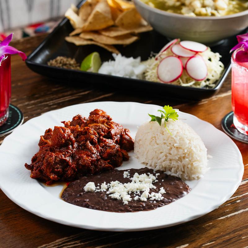 Marinated pork in guajillo sauce, served with rice, beans, and three homemade tortillas.