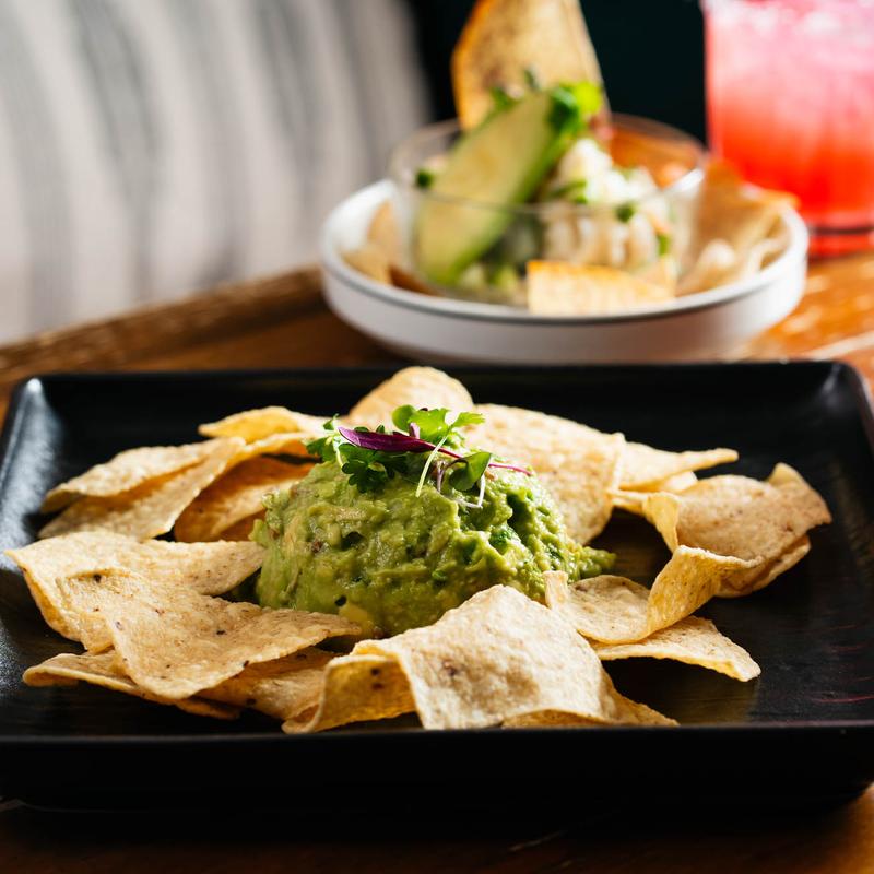 Tortilla chips, onion, cheese, fresh jalapeno, and avocado.