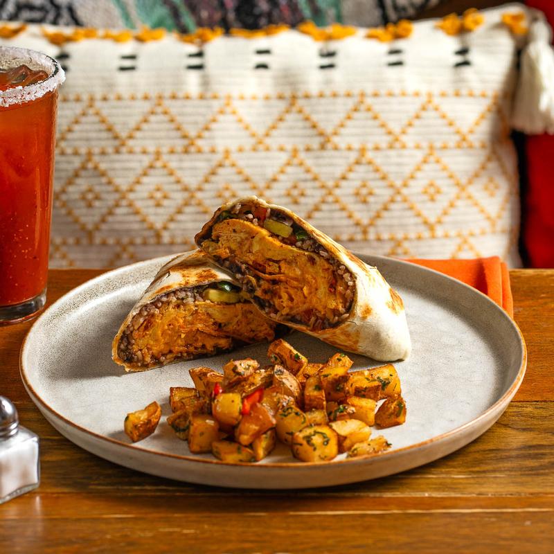 Chorizo, egg, cheese, refried beans, rice, pico de gallo, sliced avocado, and hashbrowns.