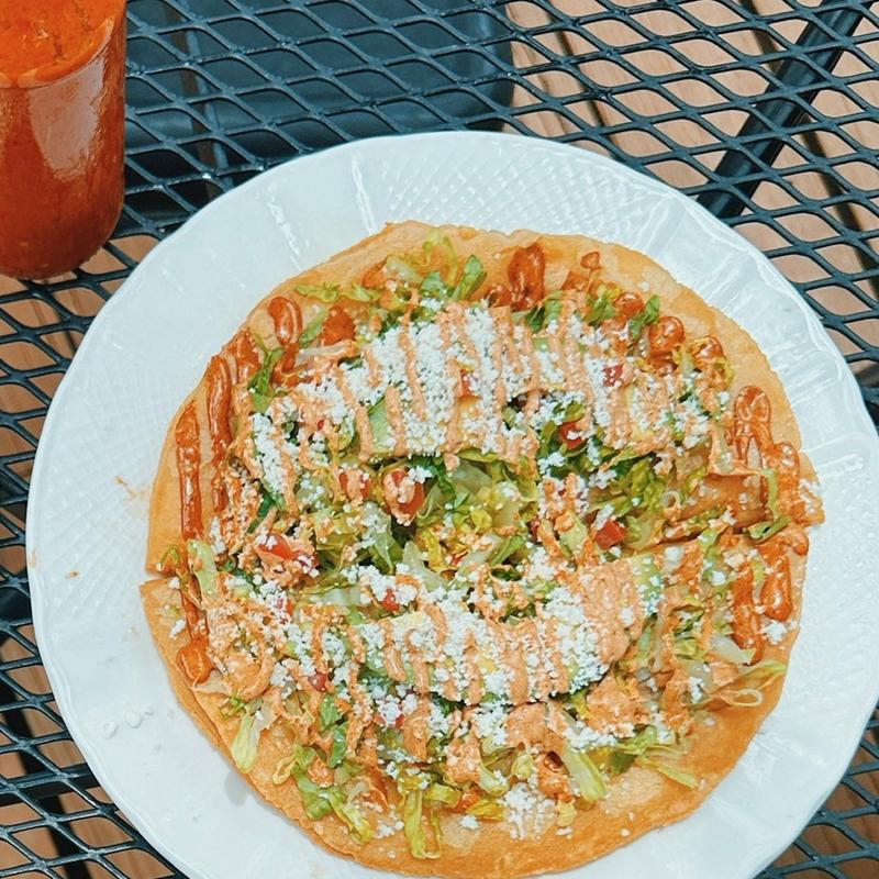 Two sopes topped with black bean spread, lettuce, tomato, queso fresco, avocado, and sour cream | Add Chicken, Pork or Beef +$4.50