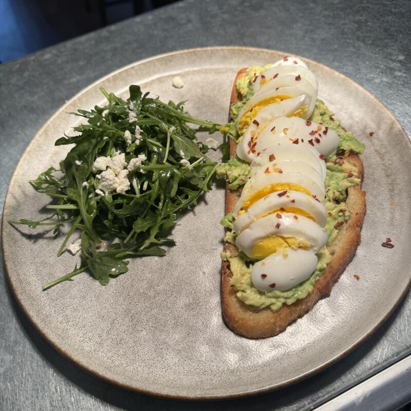 Sourdough bread, avocado, chili flakes, and egg your way.